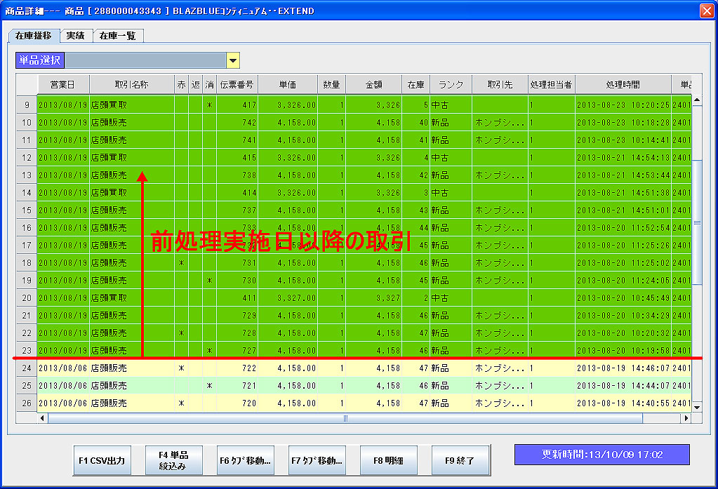 前処理実施日以降の取引は、背景色が緑色で表示されます。