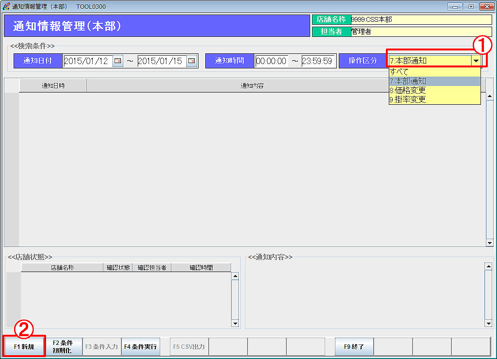 業務メニュー:「本部業務」→処理メニュー:「通知情報管理」をクリックします。