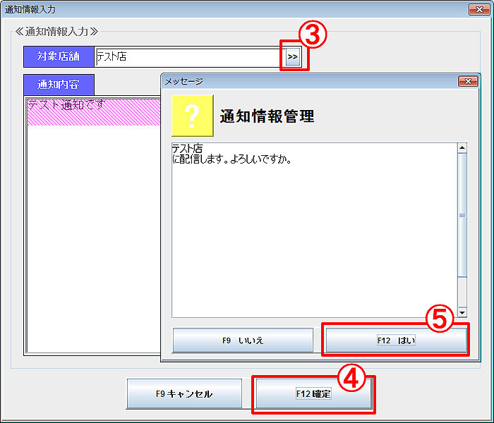 ④ 「F12確定」をクリックすると「○○店に配信します。よろしいですか。」と表示されます。