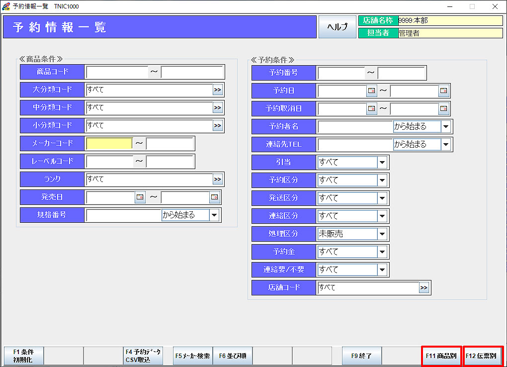 条件を入力し「F11商品別」または「F12伝票別」をクリックします。 条件に当てはまる予約情報一覧が表示されます。