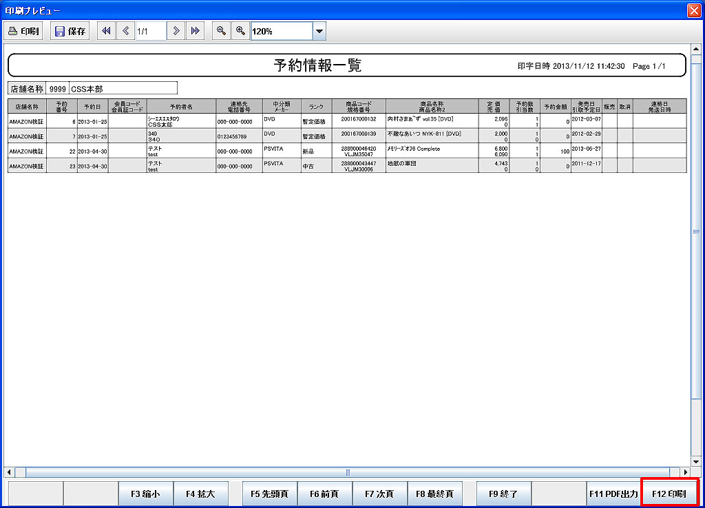 【予約情報一覧印刷プレビュー】 「F5CSV出力」:予約情報一覧を指定した場所にCSVファイルで保存します。 「F12印刷」:予約情報一覧を印刷します。 「F9戻る」:条件指定画面に戻ります。