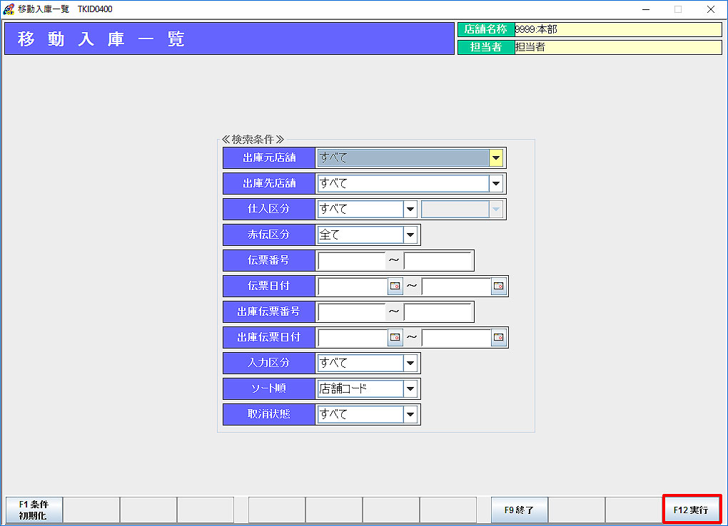「F11一覧印刷」:抽出した移動入庫一覧を印刷します。