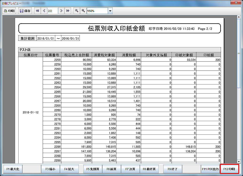 店別に収入印紙対象金額と印紙税額を集計し、伝票別・日別・月別に帳票を出力することができます。