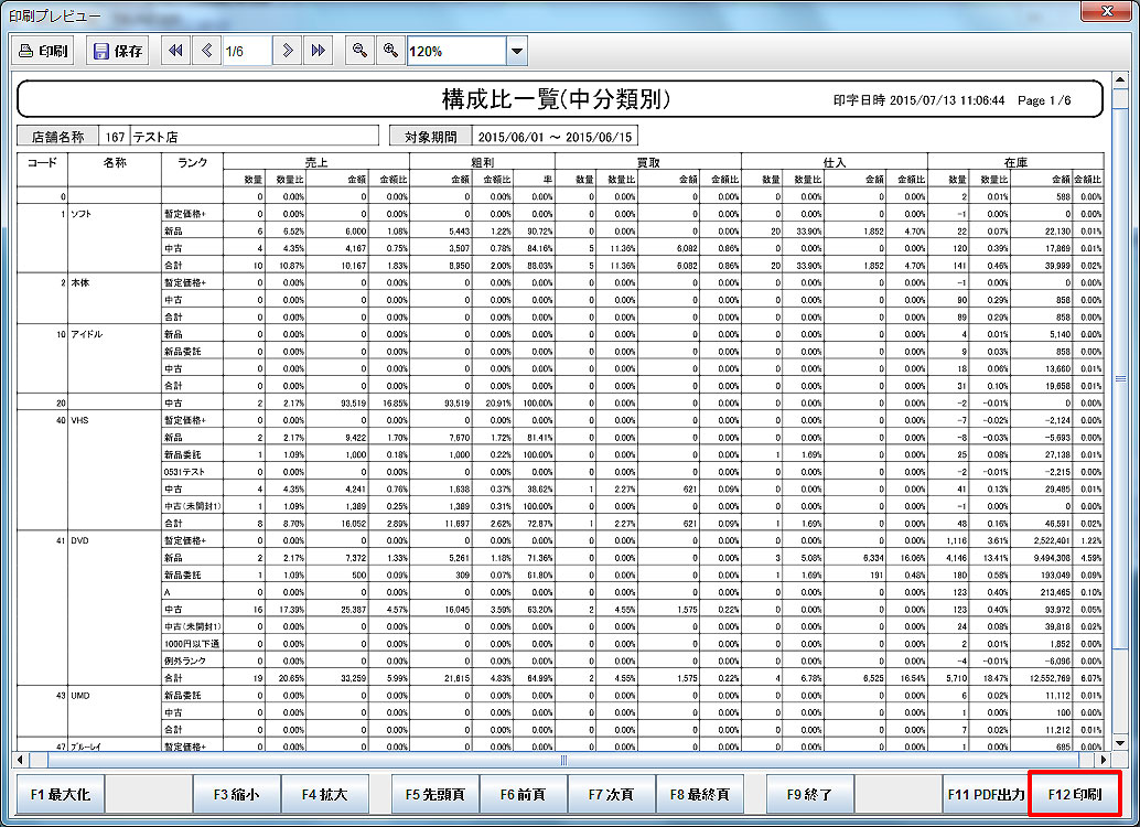 「F12印刷」:構成比一覧を印刷します。