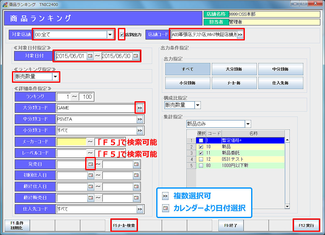 「F12印刷」:店舗別に商品ランキング一覧を印刷します。