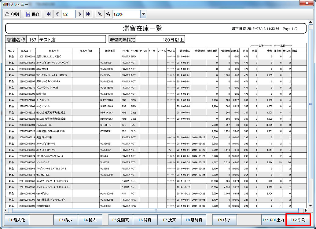 滞留在庫一覧は印刷・CSVファイルで保存もできます。