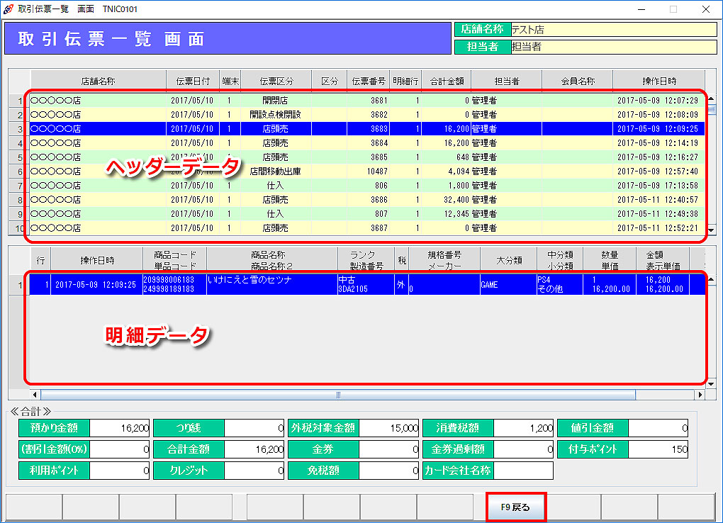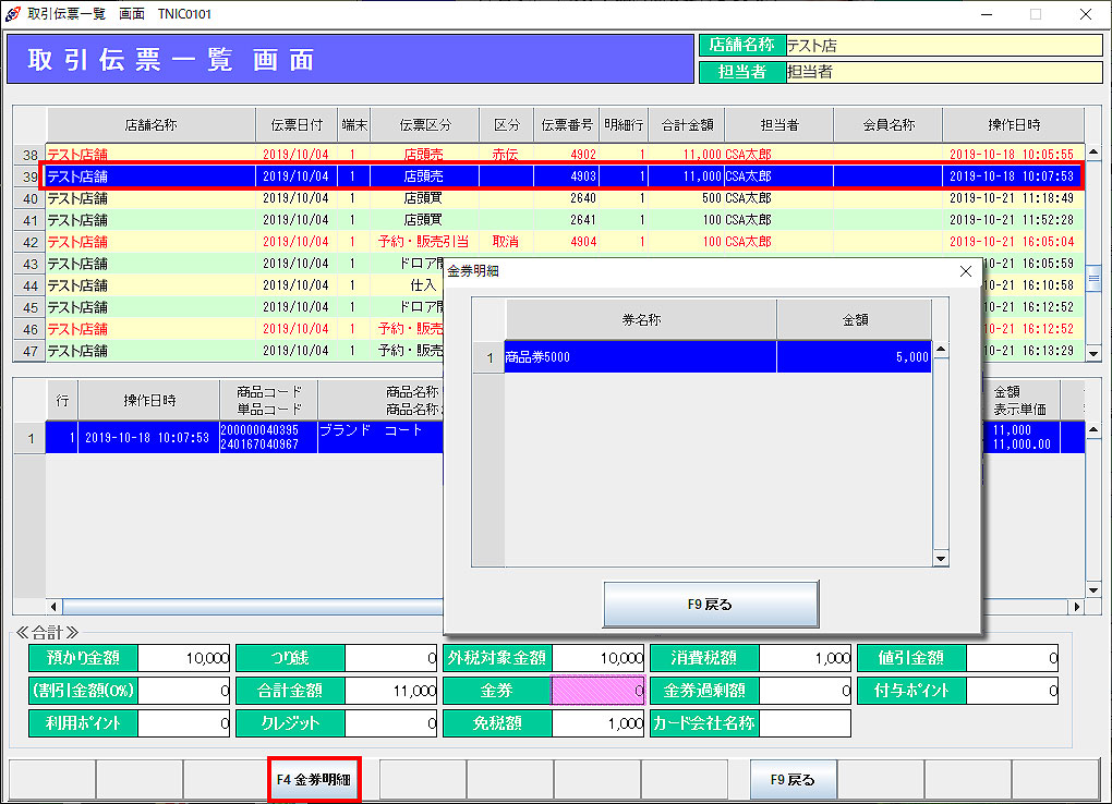 ※ 取引伝票の中に金券利用がある場合は「F4金券明細」より券種と利用額を見ることができます。
