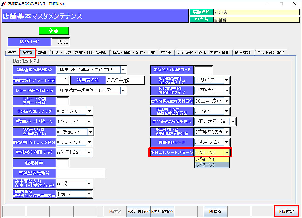 店舗基本マスタ(基本2)の「受付票レシートパターン」で「パターン1」もしくは「パターン2」より選択します。