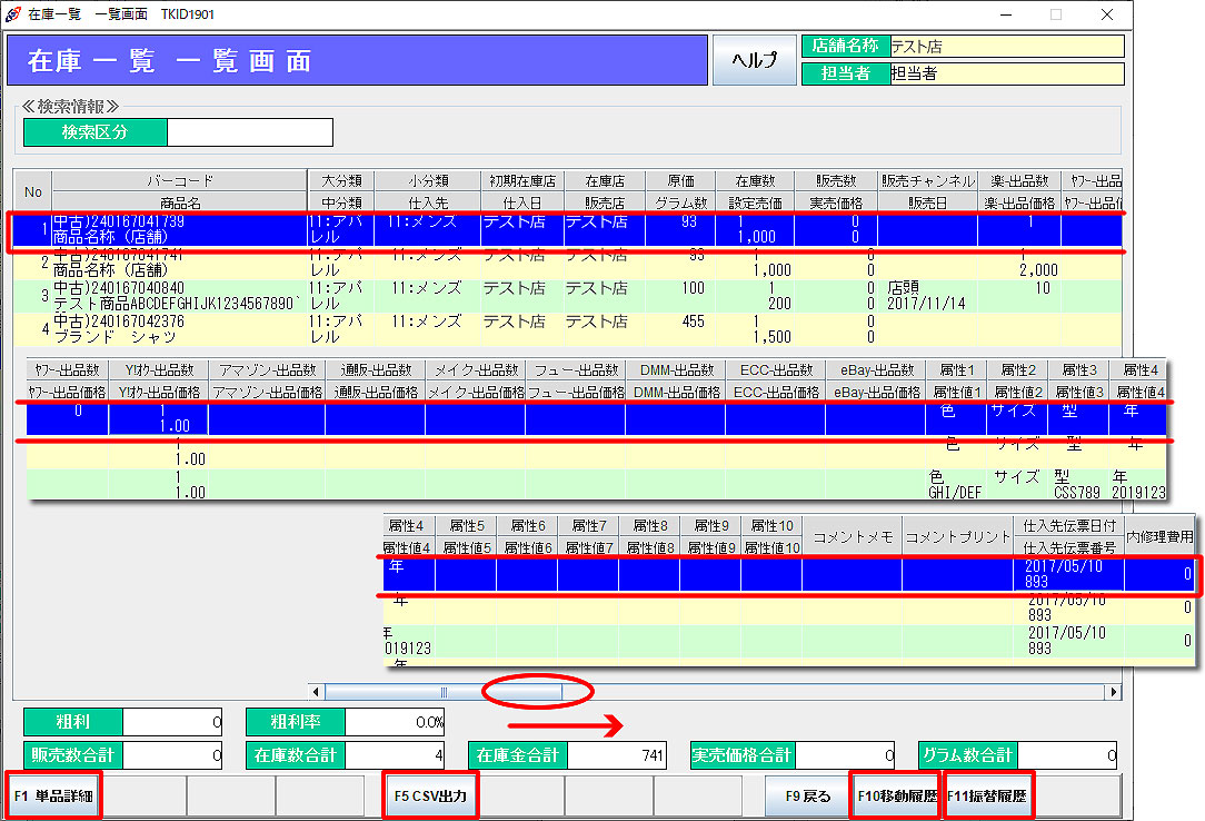 「F11振替履歴」:選択行の商品の在庫振替履歴を見ることができます。