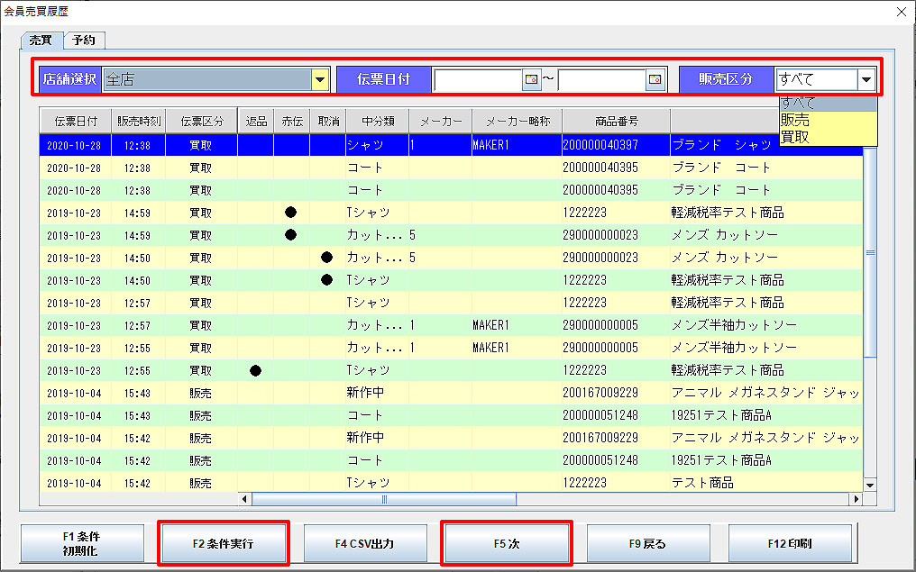 売買期間・販売区分を指定して「F2条件実行」をクリックすると、条件を絞って売買履歴を抽出することができます。