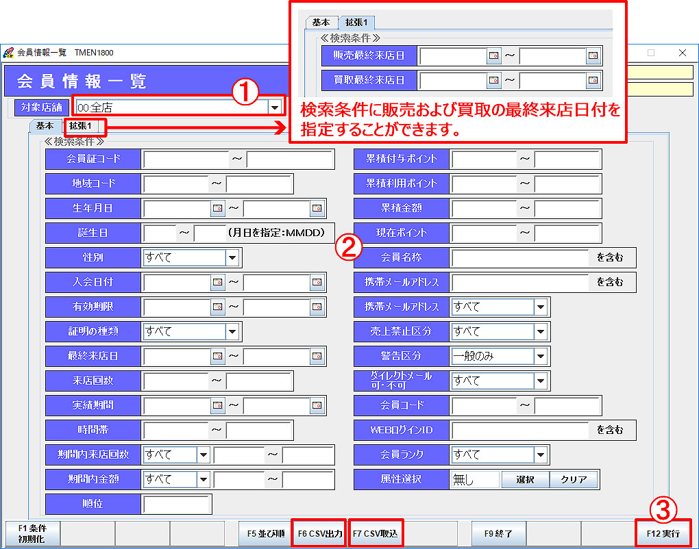 「F1 会員リストCSV」:出力した会員情報を「F7 CSV取込」で取り込み、画面に表示します。
