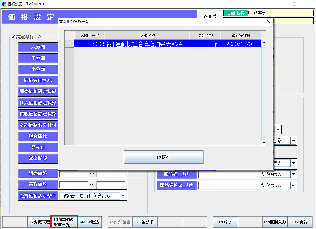 価格設定条件画面で「F3本部価格実施一覧」をクリックすると、【本部価格実施一覧】画面が表示されます。