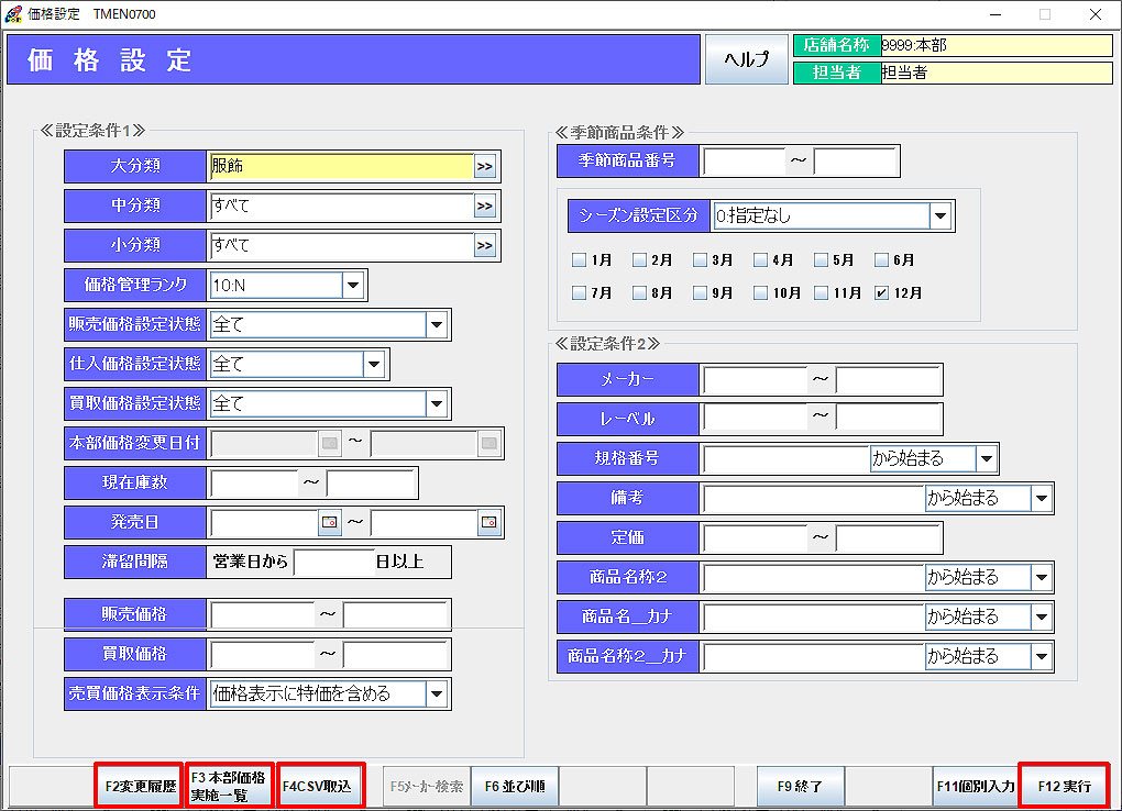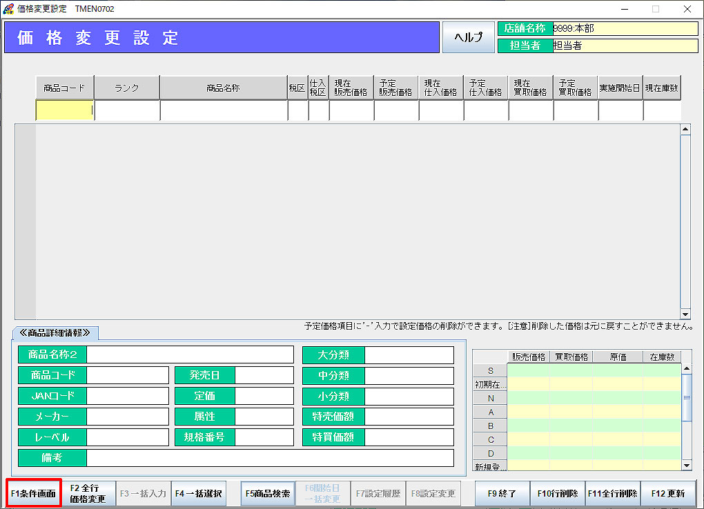 「F2全行価格変更」:リスト上の商品全ての設定価格を変更します。
