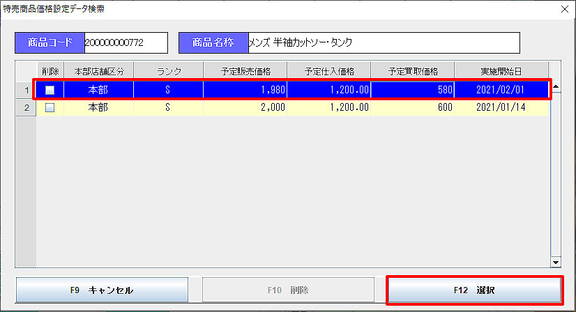 履歴の中から利用したい価格設定を選択し、「F12選択」で設定が反映されます。