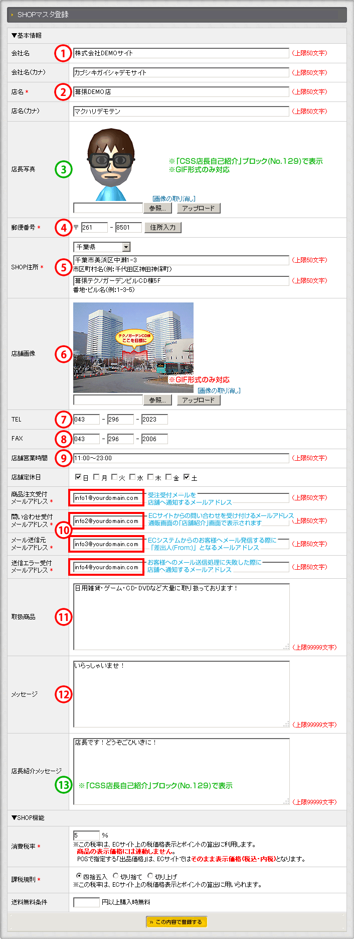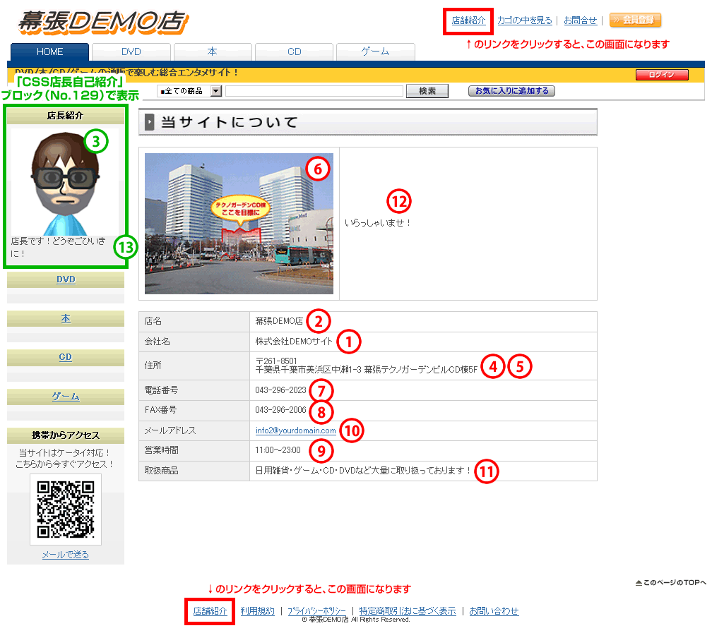③と⑬項は「店舗紹介」画面ではなく、「CSS店長自己紹介」ブロック(No.129)を利用する設定にすると表示される内容です。
