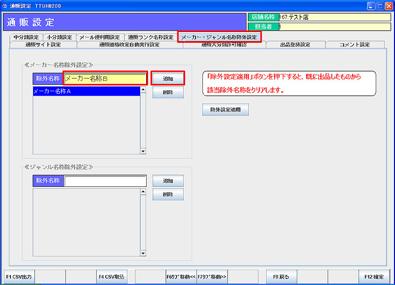 メーカー・ジャンル名称除外設定:通販サイトに表示したくないメーカー名称・ジャンル名称を設定します。