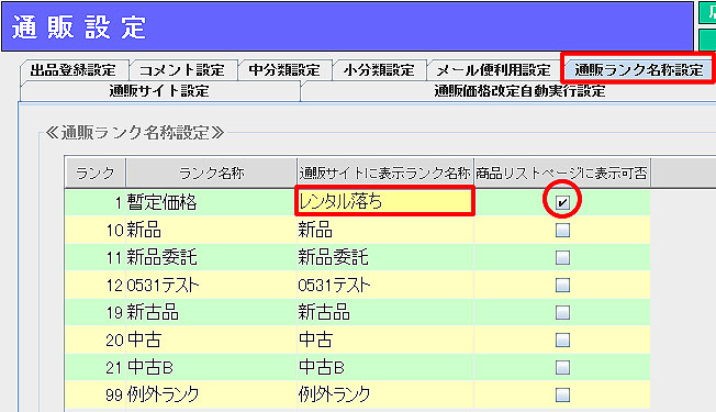 通販ランク名称設定:通販サイトに表示するランク名称の編集、表示可否を設定します。