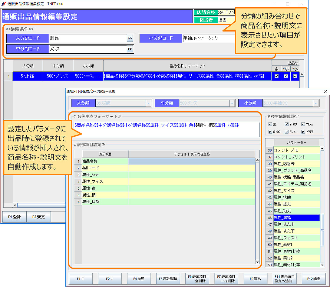 「通販タイトル生成パターン設定」では、商品説明文の表示項目設定と同時に、商品名称自動生成フォーマットも作成できます。