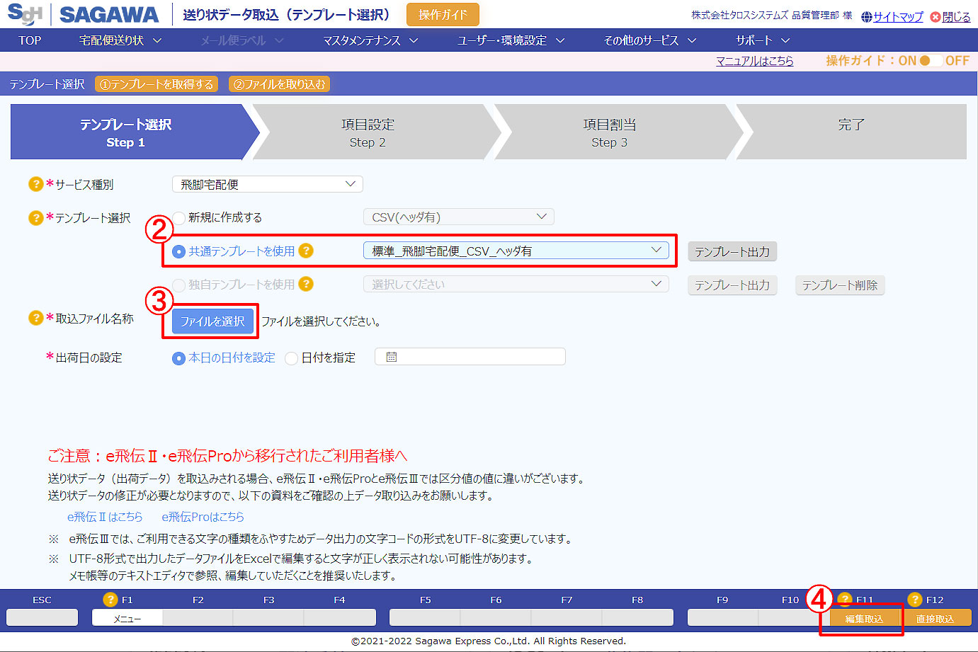 STEP2.タロスから出力した送り状CSVをe飛伝Ⅲに取り込む