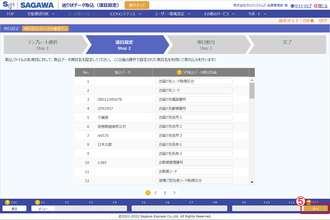 タロスから出力した送り状CSVファイルをe飛伝Ⅲに取り込み、取込ファイルの項目(入力項目)とe飛伝Ⅲ上の項目(出力項目)とを紐付けます。