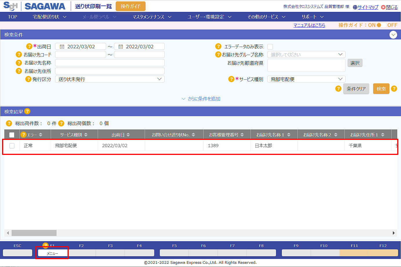 「F12出力」をクリックして送り状CSVファイルを出力します。
