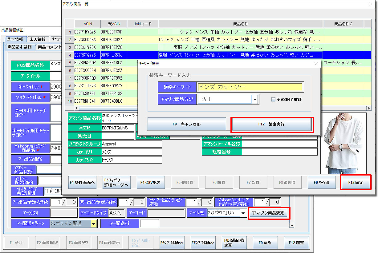 アマゾン商品変更 出品商品を抽出 → 出品情報を編集 → 「F12確定」を行うと、無効なASINコードがある場合は「アマゾンコードを入力していません。確定します。よろしいですか?」と警告メッセージが表示されます。 「F9いいえ」で出品情報編集画面に戻り、「基本情報タブ>商品基本情報タブ>アマゾン商品変更」を押して、アマゾン検索よりASINコードを再設定してください。