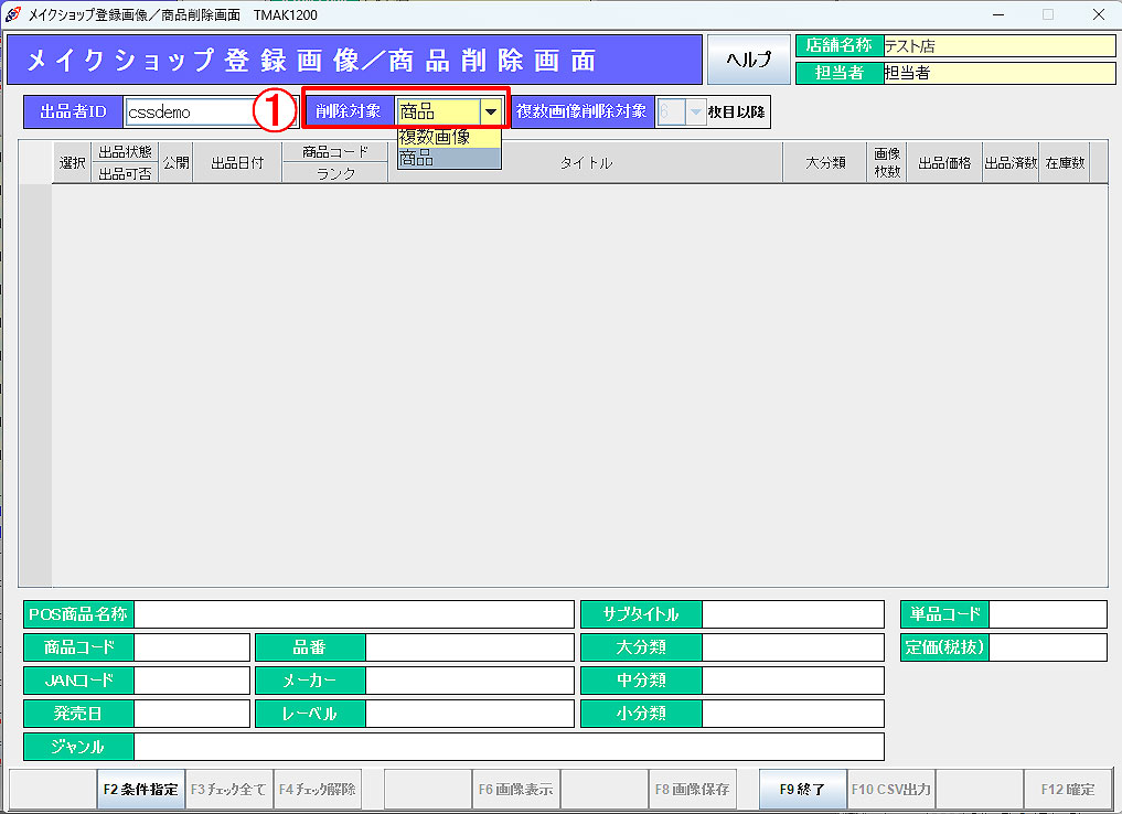 メイクショップ登録画像/商品削除画面 ①「削除対象」に「商品」を選択します。