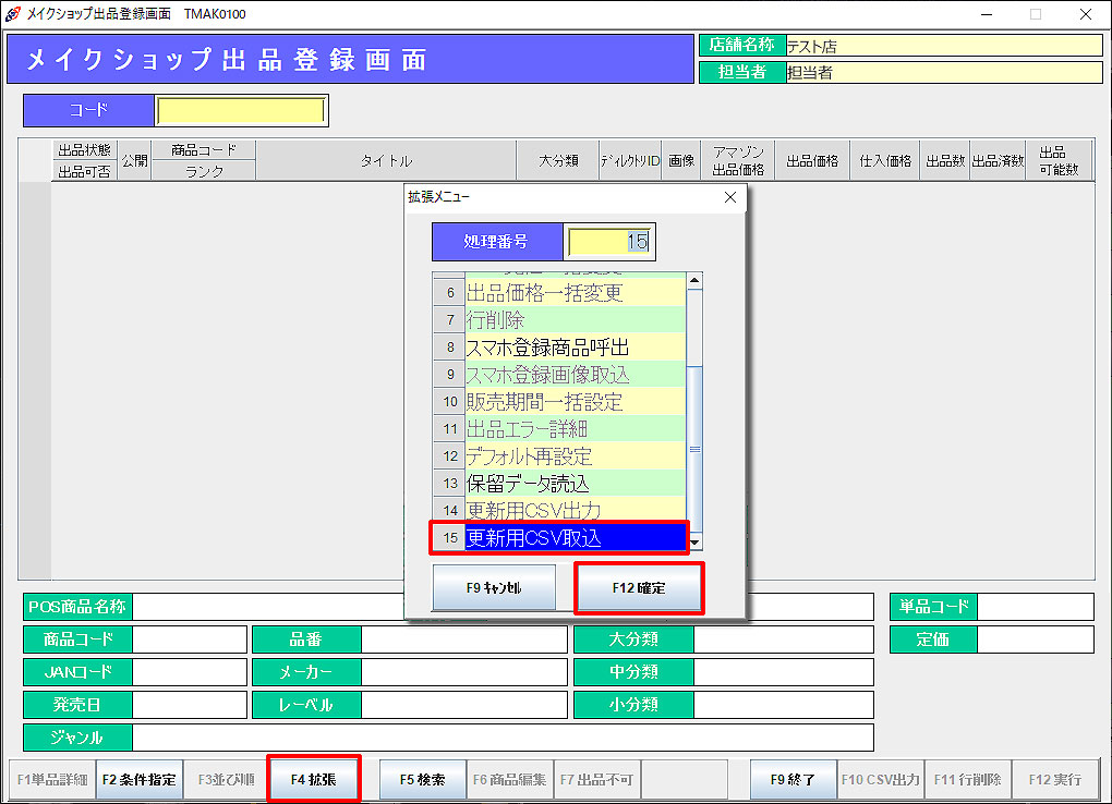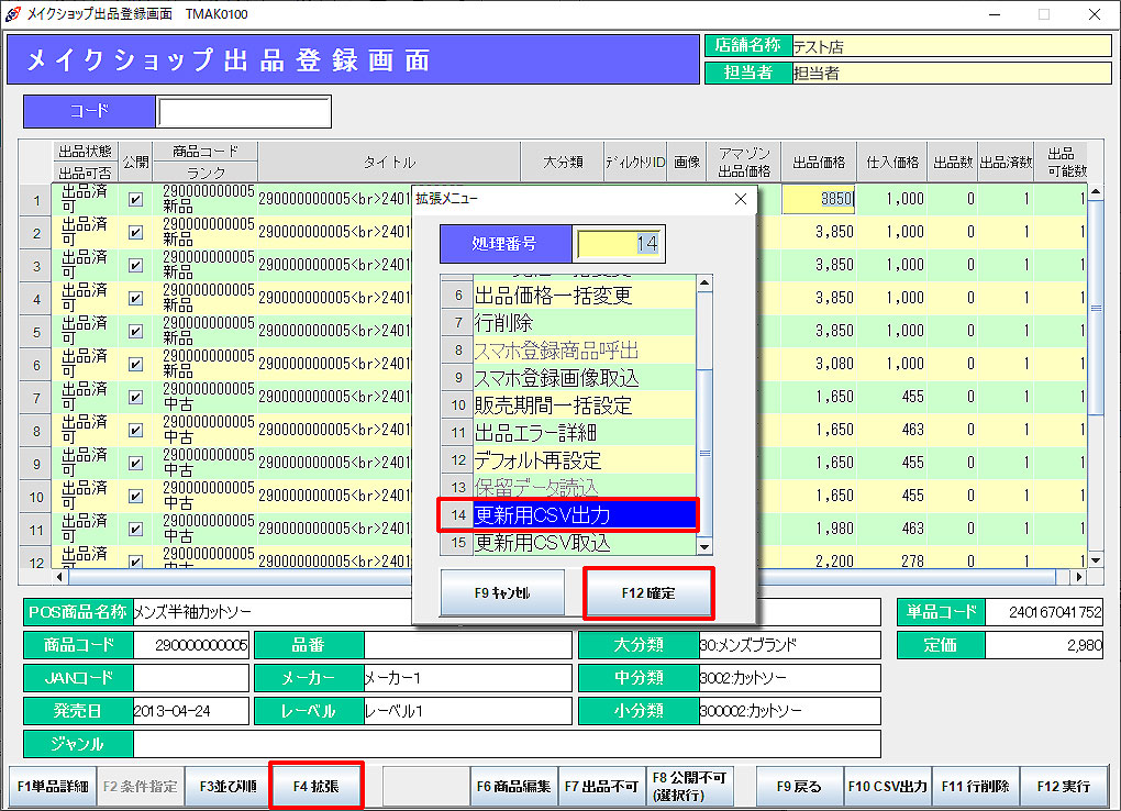 「F4拡張」メニューより「更新用CSV出力」を選択し、「F12確定」をクリックします。