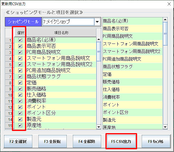 MakeShop更新用CSV出力 4.CSVに出力する項目を選択する画面が表示されます。