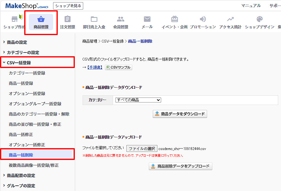 「商品管理>CSV一括登録>商品一括削除(新管理画面:商品管理>商品一覧>アップロード・ダウンロード>商品一括削除)」を開きます。