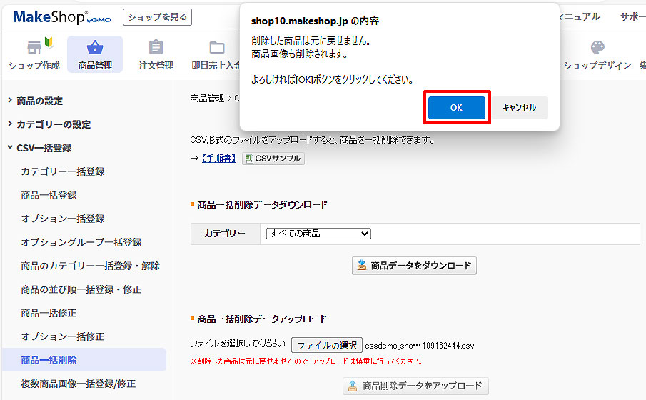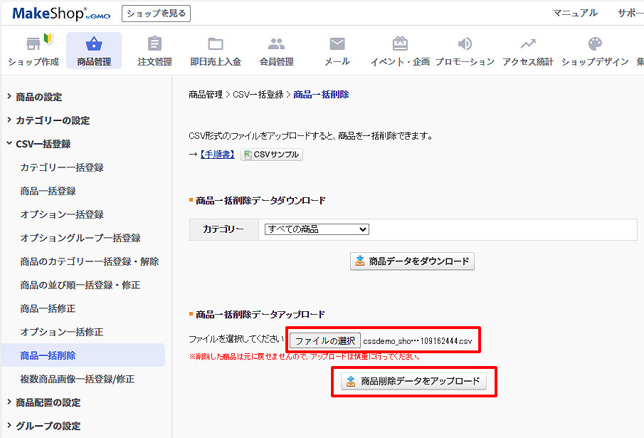 「商品削除データをアップロード」をクリックします。