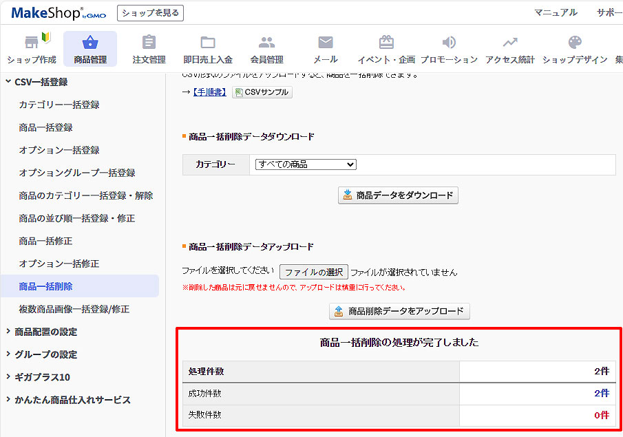 ④ 商品一括削除の処理が完了し、処理件数が表示されます。