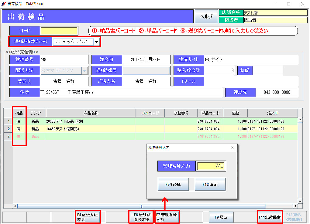 ※ 通販入力で、送料などの「在庫チェックなし商品」を登録された場合、出荷検品画面には呼び出されません。 自動で「検品済」に変わり、出荷確定対象商品となります。