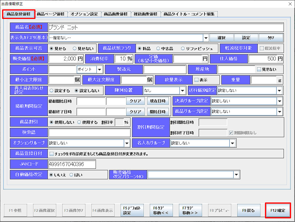 「F12確定」で出品情報を保存し、出品登録画面に戻ります。