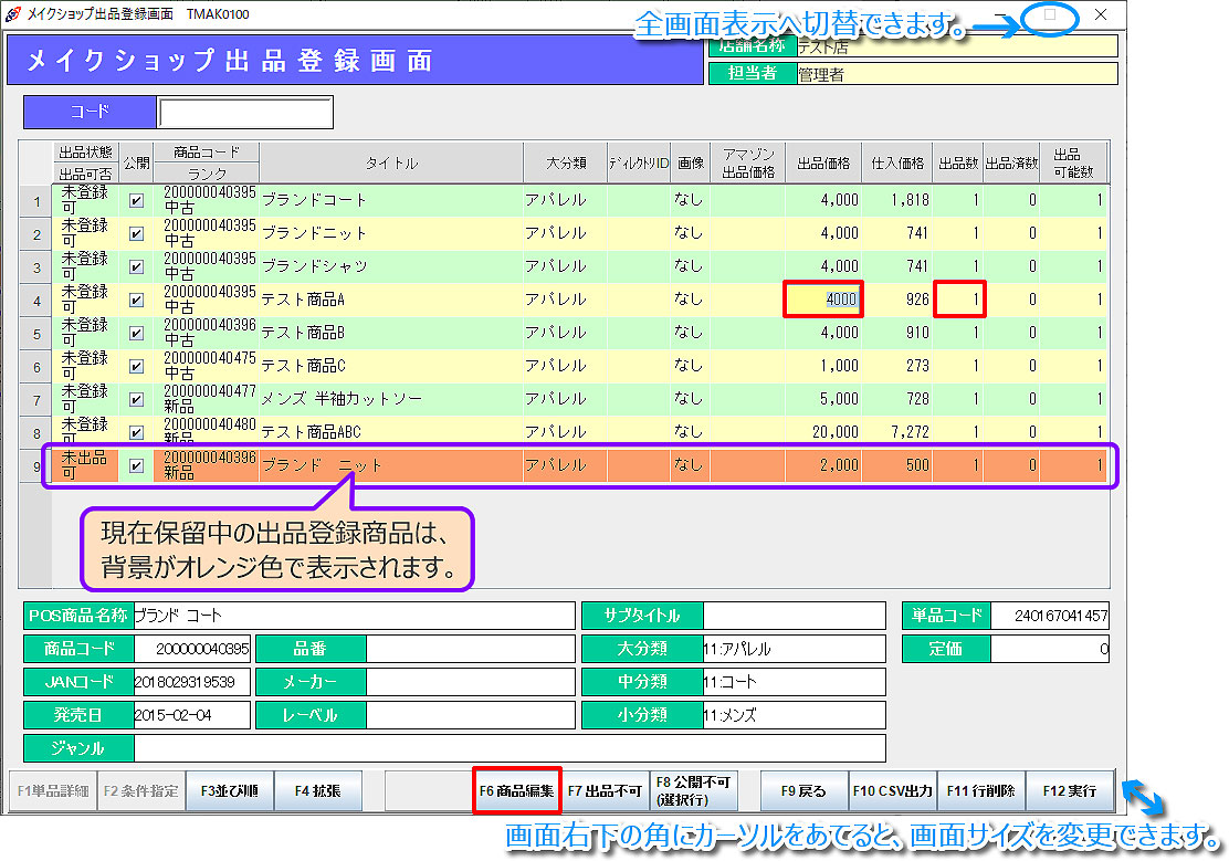 - 「F7出品不可/出品可」:選択した商品を出品しない/する