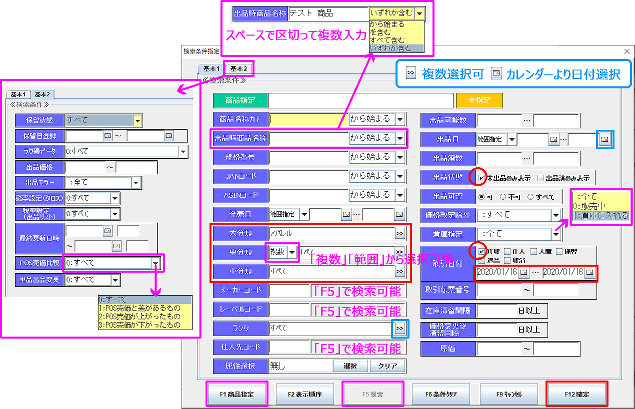 ※ 「F1商品指定」より「商品コード」「JANコード」「規格番号」「単品コード」で商品を指定することもできます。