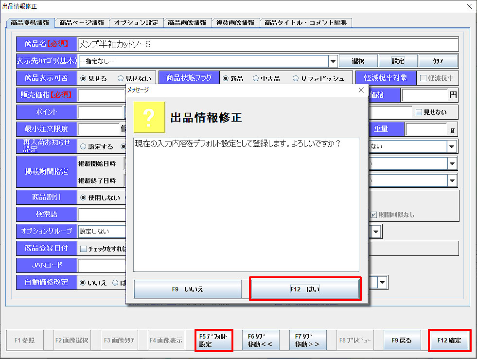 デフォルト設定後「F12確定」で出品情報の設定を確定してください。