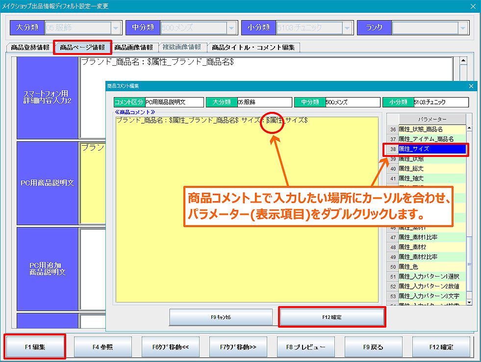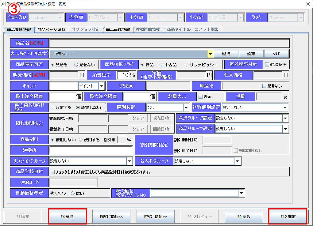 MakeShop出品情報ディフォルト設定 ③ メイクショップ出品情報ディフォルト設定-変更画面が表示されます。 出品情報を編集し、「F12確定」で変更を確定します。