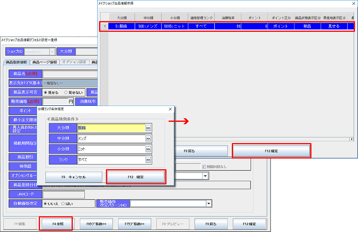 楽天出品情報参照 【出品情報ディフォルト設定】画面で「F4参照」をクリックします。【分類ランク条件指定】画面が表示されます。 検索条件を指定して出品情報を抽出します。 利用したい出品情報を選択して「F12確定」をクリックすると、そのデータが反映されます。 編集して新しく登録することができます。