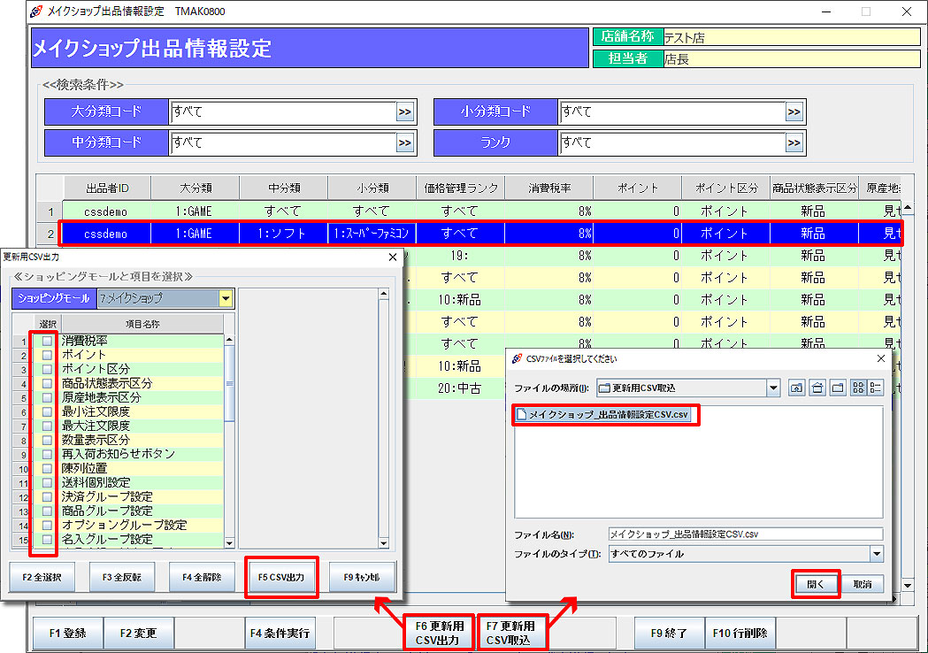 更新用CSV出力・取込 【出品情報設定】画面で編集を行いたい出品情報を選択し「F6更新用CSV出力」をクリックします。【更新用CSV出力】画面が表示されます。 CSVに出力したい項目の選択列にチェックを入れ、「F5CSV出力」をクリックします。 CSV編集ツールで編集後、「F7更新用CSV取込」より取り込みます。