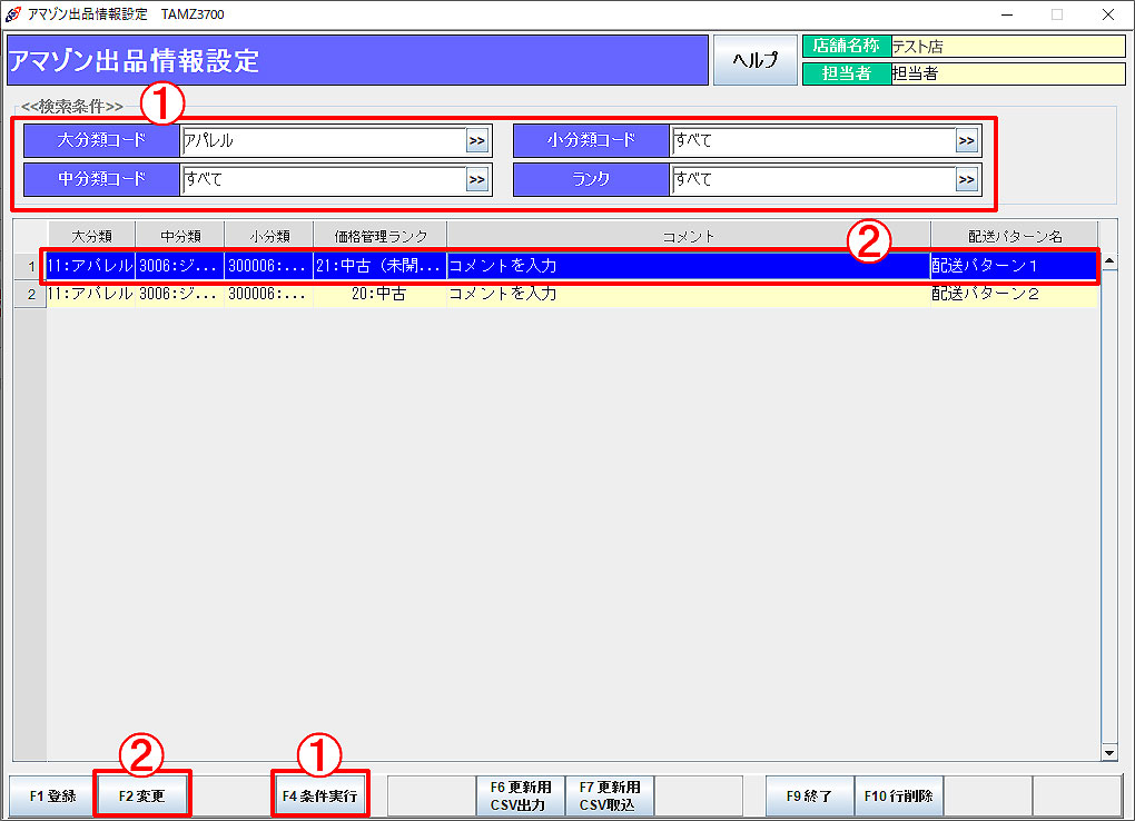 ① 検索条件に大・中・小分類、ランクを選択し、「F4条件実行」