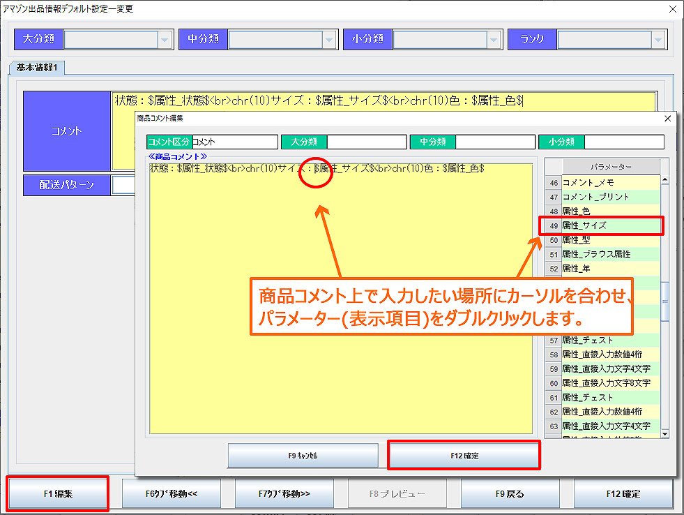 コメント入力欄にカーソルがある状態で「F1編集」をクリックします。 【商品コメント編集】画面が別画面で開きます。