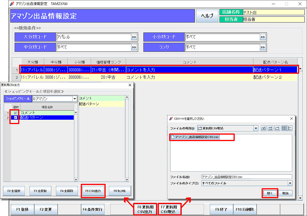 【出品情報設定】画面で編集を行いたい出品情報を選択し「F6更新用CSV出力」をクリックします。【更新用CSV出力】画面が表示されます。 CSVに出力したい項目の選択列にチェックを入れ、「F5CSV出力」をクリックします。 CSV編集ツールで編集後、「F7更新用CSV取込」より取り込みます。