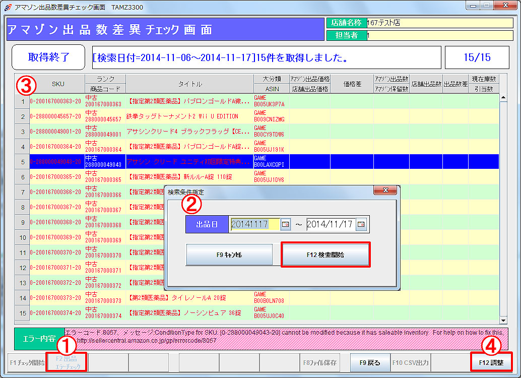 POS側出品数とアマゾン出品数の差異のあるものを抽出し、調整します。