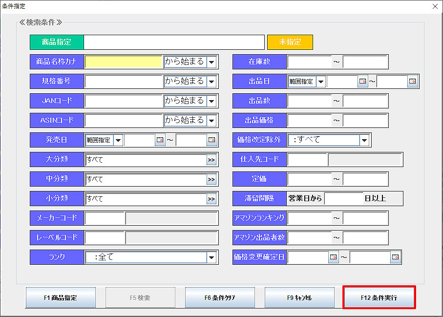 ※ 条件は何も指定しなくても実行可能ですが、仕入先やランクなど、条件を絞ると更新時間が短縮されます。