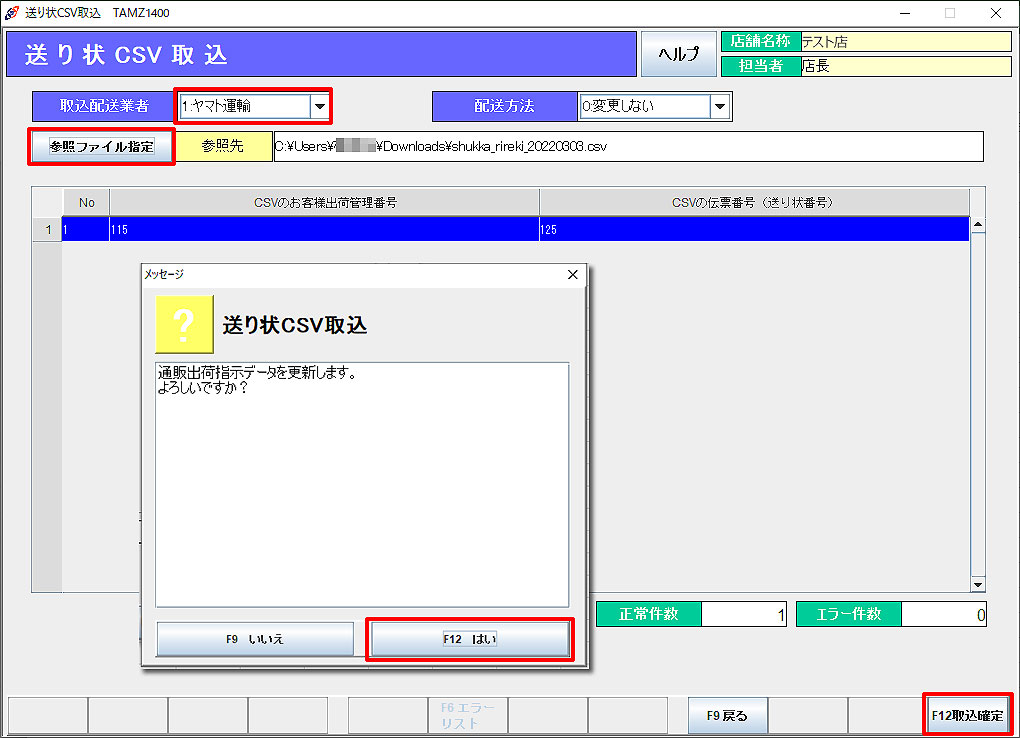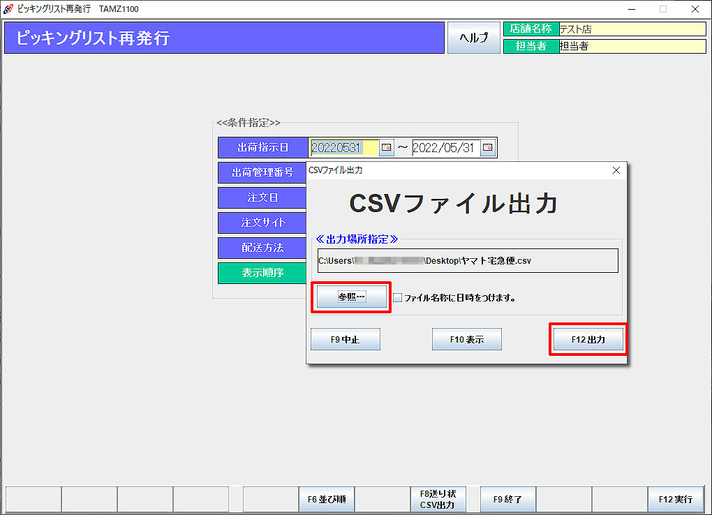「F12出力」をクリックして送り状CSVファイルを出力します。