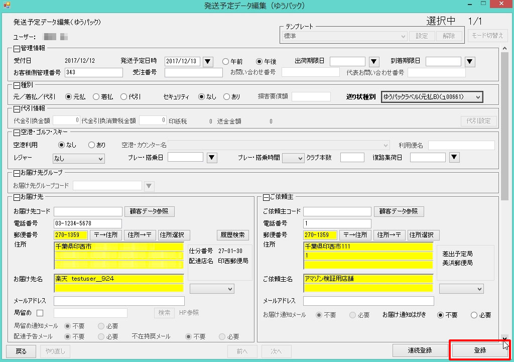 ※ 固定の発送元情報(ご依頼主情報)は、ゆうプリR側で事前に登録が必要です。