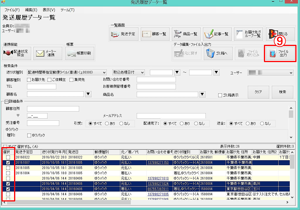 ⑨ ファイル出力を行うデータを検索し、選択チェックボックスにチェックを入れます。