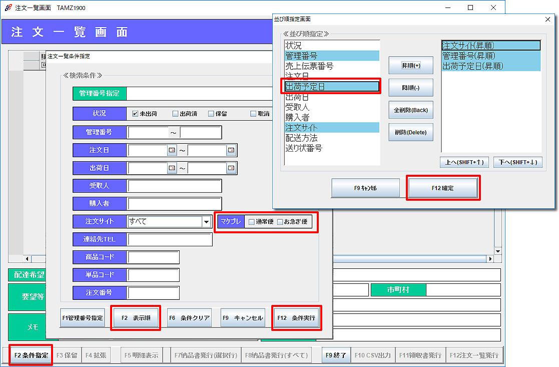 ③ 「状況」を選択し、その他検索条件を入力して「F12条件実行」をクリックします。 条件に当てはまる注文データが表示されます。