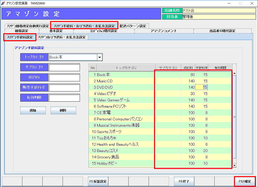アマゾン手数料設定:サブカテゴリーによりアマゾン手数料に変更があった場合に、追加・削除を行います。